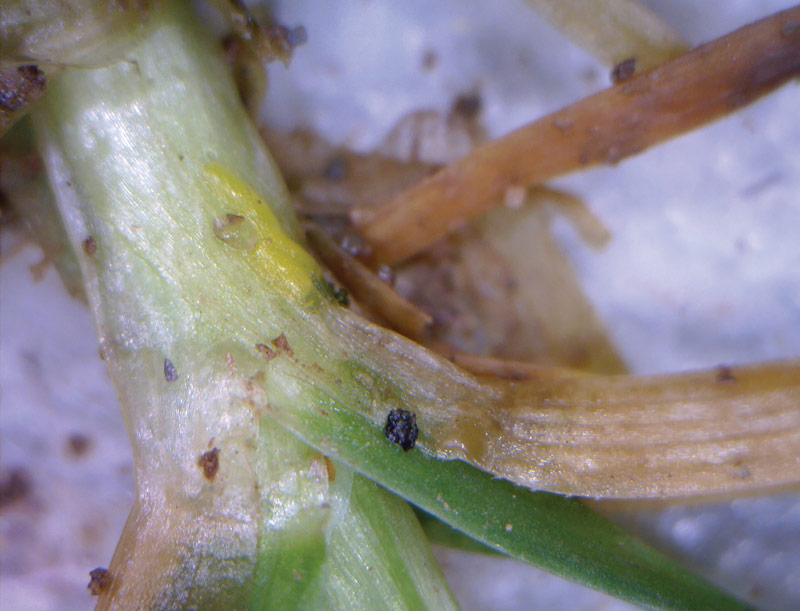 Figure 6. Two recently oviposited annual bluegrass weevil eggs (yellow) can be seen through the leaf sheath on this Poa annua tiller.