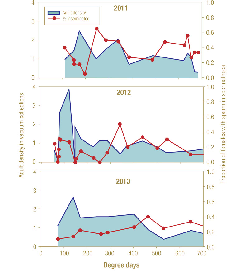 A low to moderate proportion of the female population was found to have sperm in their spermatheca at any time during the study (Figure 9). The highest percentages of inseminated females (40% to 60%) in a season were detected after the second adult density peak (~250 to 460 GDD) in each year of the study. Females were found with eggs in their calyx when they arrived at oviposition sites. Populations did not display a defined peak or synchronicity in the development of eggs, and, like mating, the average number of eggs did not show any consistent trends between seasons.