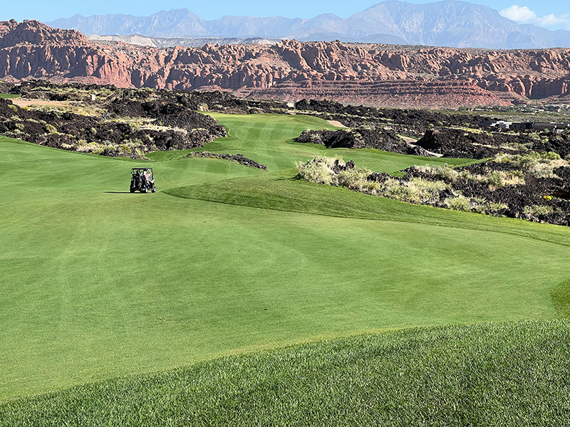 It’s undeniably striking. The black rock contrasts with the lush green of the turfgrass, the deep blue of the water features, the azure of the enormous sky, and, of course, the surrounding red rock mountains that race up to meet that sky. During