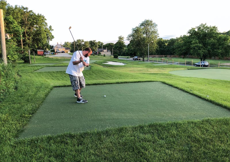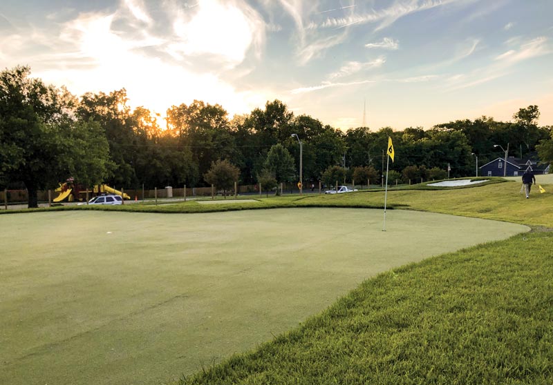 Synthetic greens at Harris Park have four holes each. Tees are also synthetic, while the fairway is zoysiagrass and the rough is fescue. Photo by Andrew Hartsock