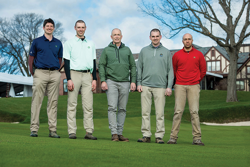 The leadership team in the maintenance department at Oak Hill CC includes (from left) Kevin Carpenter, West Course assistant; Aleks Schuler, East Course assistant; Corcoran; Mike Kincaid, East and West Course superintendent; and Marcus Chestnut, championship coordinator.