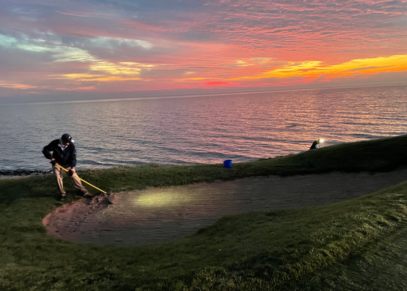 The maintenance team is using a concept it calls “Pro Greens,” in which 10 teams evenly split mowing, rolling and Stimpmeter-measurement duties on the Straits Course putting surfaces (including practice greens). The concept is similar to one first employed when the course played host to the 2005 PGA Championship and has been repeated and refined in its other major championship turns — the 2007 U.S. Senior Open, and the 2010 and 2015 PGAs.