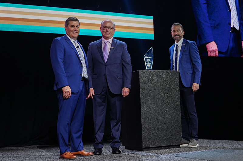 GCSAA president Jeff L. White, CGCS and GCSAA CEO Rhett Evans congratulated Pat Finlen, CGCS, the recipient of the 2025 GCSAA Col. John Morley Award.