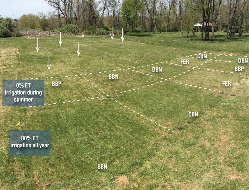 Figure 2. Top: This September 2015 photo of the research site shows the effects of fertility treatments with no summer irrigation and with 80% ET irrigation throughout the year. Bottom: The same study area on April 1, 2016. Fertility treatments were: FER, annually applied synthetic fertilizer nitrogen, phosphorus and potassium; DBN, biosolids applied annually at agronomic nitrogen rate; BBN, blended biosolids-sand-sawdust applied annually at agronomic nitrogen rate; BBP, blended biosolids-sand-sawdust applied annually at agronomic phosphorus rate plus supplemental fertilizer nitrogen; CBN, composted biosolids applied annually at agronomic nitrogen rate. Arrows indicate the additional replications of the FER treatment. Photos by Mike Badzmierowski