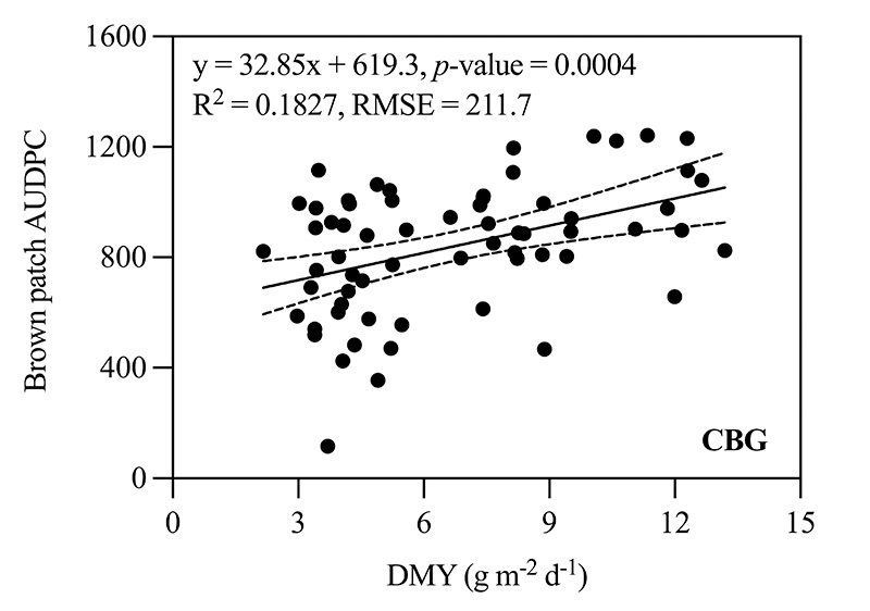Brown patch AUDPC between N rates was also independently analyzed within each cool-season species (CBG and TTTF cultivars averaged). For CBG, the higher N rate increased brown patch AUDPC by 17% compared to the lower N rate (915.9 versus 762.7, respectively). Brown patch AUDPC also increased by 33% for the higher N rate compared to the lower N rate for the PRG blend (1,046.2 versus 696.6, respectively). When comparing DMY to brown patch AUDPC within individual species using linear regression, a positive relationship was observed for CBG cultivars and the PRG blend (i.e., brown patch severity increased as DMY increased) (Figure 3). There were no differences in brown patch AUDPC between N rates for CLBG or TTTF, and a relationship between DMY and AUDPC for these species was not observed.