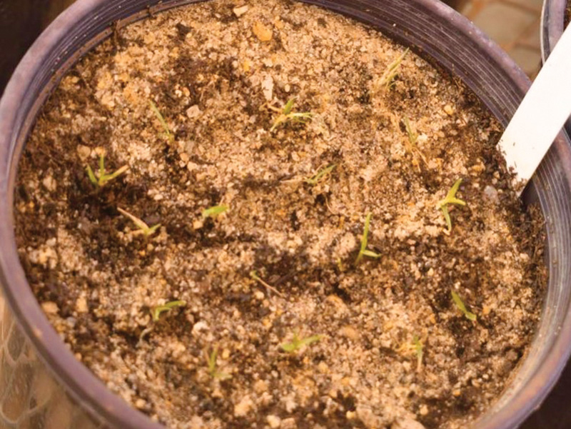 Figure 1. Annual bluegrass and creeping bentgrass tillers on day of planting. Tillers were alternatively planted so that next to each annual bluegrass tiller was a creeping bentgrass tiller and vice versa. Photo by Brandon McNally