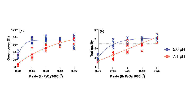 Figure 4. Relationship of phosphorus (P) fertilizer rate and green cover (a) and turf quality (b) at 90 days after planting when grown under two different soil pH levels. Turf quality was visually assessed on a scale of 1 (poor) to 9 (ideal), with 6 considered as the minimum acceptable level.