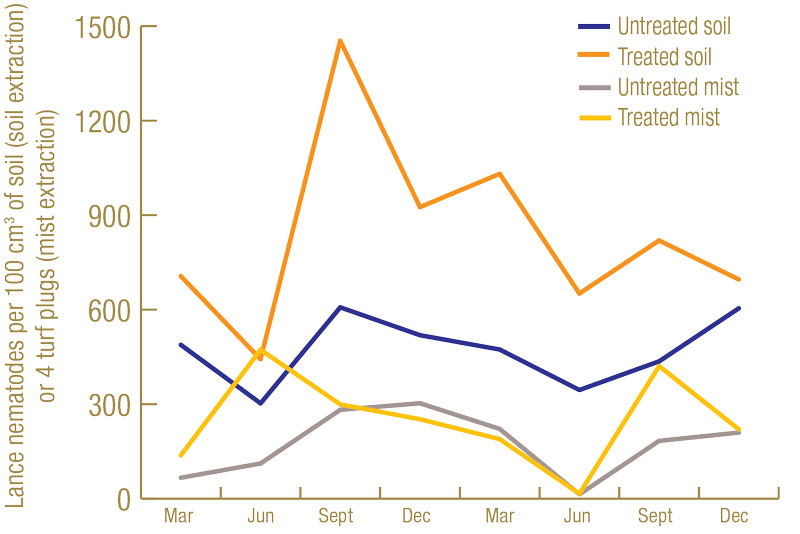 Figure 2. Average number of lance nematodes recovered by centrifugal flotation from 100 cubic centimeters of soil, or by mist extraction from four 1.5-inch-diameter (3.8-centimeter-diameter) turf plugs over the course of the experiment at the South Florida site from 60 untreated or 60 nematicide-treated plots.